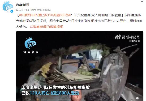 【印度列车相撞已致120死超800伤:车头被撞扁 众人爬侧翻车厢救援】据印度媒体当地时间6月3日报道,印度奥里萨邦2日发生的列车相撞事故已致120人死亡,超过800人受伤。