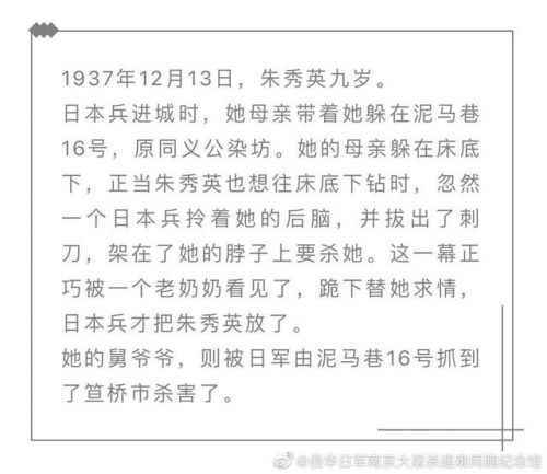 她的母亲躲在床底下,正当朱秀英也想往床底下钻时,忽然一个日本兵拎着她的后脑,并拔出了刺刀,架在了她的脖子上要杀她。