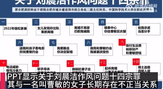 PPT列举了刘晨洁作风问题十四宗罪,其与曹姓女子长期存在不正当关系,且存在拒付生活费,转移财产,博士造假违规入读等行为。该女子称2022年2月2日在宿松县黎明酒店,她被刘晨洁殴打。记者联系到合肥市城乡建设局,工作人员称已接到反映,若情况属实会有专人去调查。