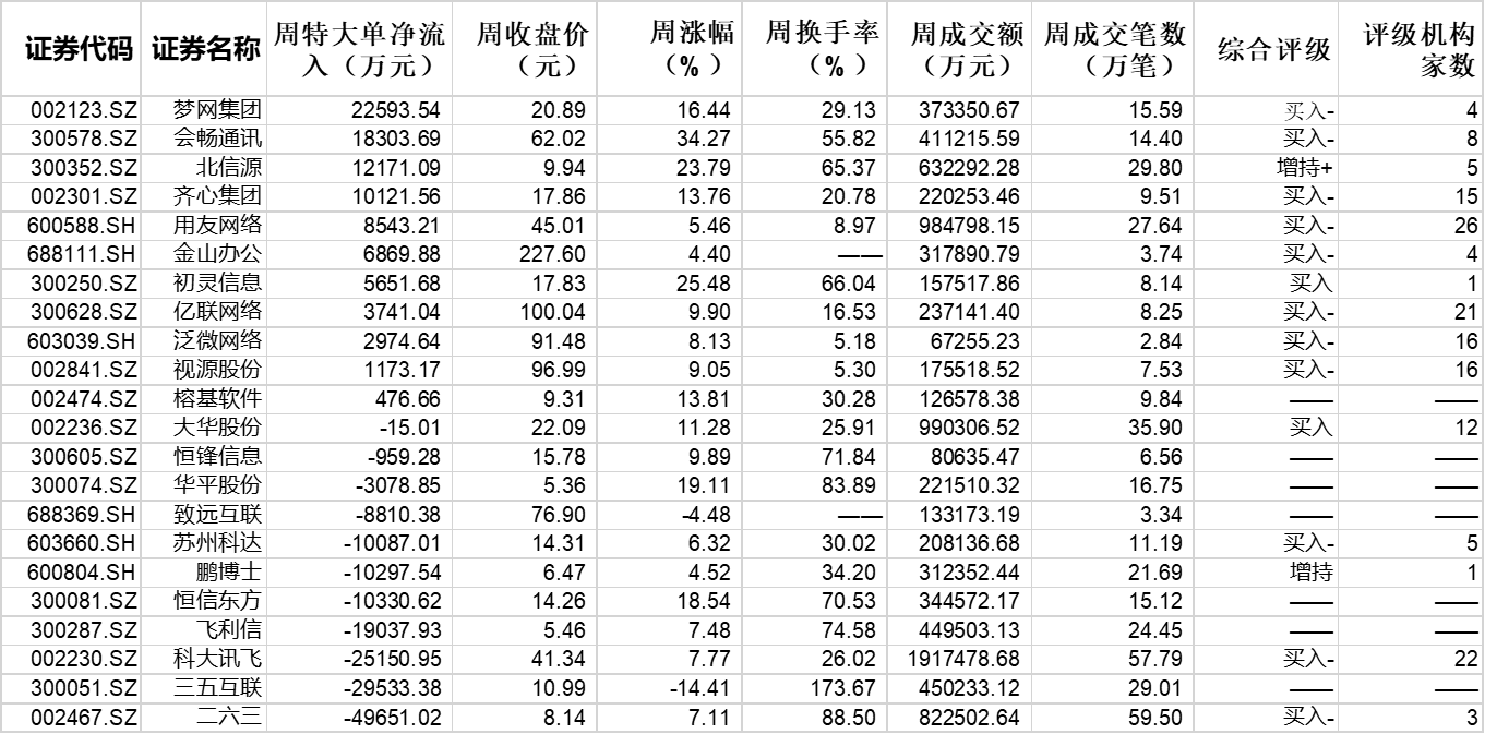 个股表现方面,上周板块内交易中的22只个股呈普涨格局,有20只个股上涨,2只个股下跌,上涨股占比90.91%,会畅通讯、初灵信息和北信源期间涨幅居前,周涨幅均超23%,此外,尚有包括华平股份、恒信东方、梦网集团等在内的6只个股周涨幅超10%。从特大单资金流向来看,上周板块中有11只个股呈特大单净买入态势,合计买入9.26亿元,其中,梦网集团特大单净流入额位居板块首位,累计净买入22593.54万元,会畅通讯和北信源排在第二和第三位,净买入额分别达18303.69万元和12171.09万元。