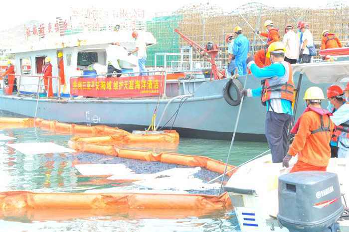 6月5日,三亚海事局组织辖区7家旅游航运公司、4家游艇俱乐部、8家危险品作业单位等共19家公司、60余人在西岛肖旗港举办首次船舶防污染应急设备及溢油处置实操演练。图为海上防污染应急人员在进行吸油拖栏、吸油毡、围油栏、收油机、卸载泵、消油剂、喷洒装置等溢油应急设备实操演练。