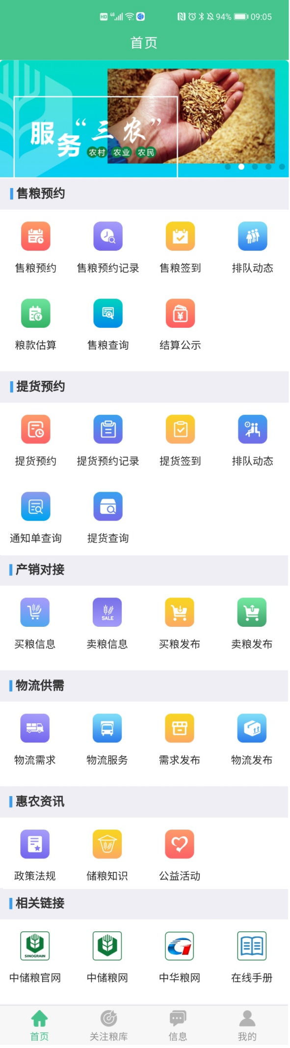今年,在优化预约售粮系统、改善用户体验的基础上,“惠三农”综合服务平台(以下简称“惠三农”平台)升级推出。据介绍,“惠三农”平台重点拓展四大服务功能:一是新增提货预约功能,用粮客户可以在线预约出库,做到少排队、快出库、随到随提,减少物流成本;二是新增物流供需对接功能,建立物流运力供应信息与需求信息服务平台,促进供需双方精准对接、一键快连;三是新增产销信息对接功能,引导粮食供需信息引流上线,促进信息公开透明,促成交易;四是新增惠农资讯提供功能,及时发布粮食政策、储粮知识、市场信息和粮库动态等信息,帮助用户实时了解国家有关政策和行业资讯。依托升级版的“惠三农”综合服务平台,中储粮将服务从售粮农民延伸到用粮客户,从粮食交易延伸到粮食物流,从提供单一收购信息延伸到提供综合信息,更好发挥在粮食产业链中集聚带动作用。