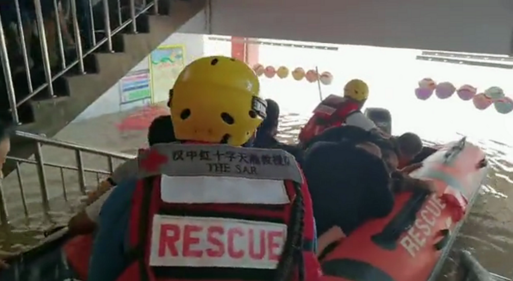 图:汉中红十字天瀚救援队在灾情严重的新乡市寺庄顶村搜救受灾群众