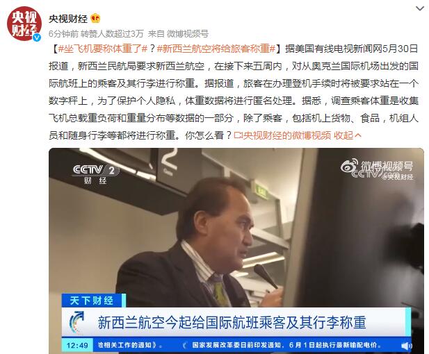【坐飞机要称体重了?新西兰航空将给旅客称重】据美国有线电视新闻网5月30日报道,新西兰民航局要求新西兰航空,在接下来五周内,对从奥克兰国际机场出发的国际航班上的乘客及其行李进行称重。据报道,旅客在办理登机手续时将被要求站在一个数字秤上,为了保护个人隐私,体重数据将进行匿名处理。据悉,调查乘客体重是收集飞机总载重负荷和重量分布等数据的一部分,除了乘客,包括机上货物、食品,机组人员和随身行李等都将进行称重。你怎么看?