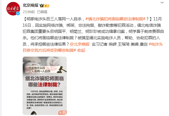 11月16日,因实施网络诈骗、绑架、非法拘禁、敲诈勒索等犯罪活动,缅北电信诈骗犯罪集团重要头目明国平、明菊兰、明珍珍被成功缉拿归案,明学昌于前夜畏罪自杀。他们将面临哪些法律制裁?被骗至缅北实施电诈人员,帮助、协助犯罪的人员,将承担哪些法律后果?