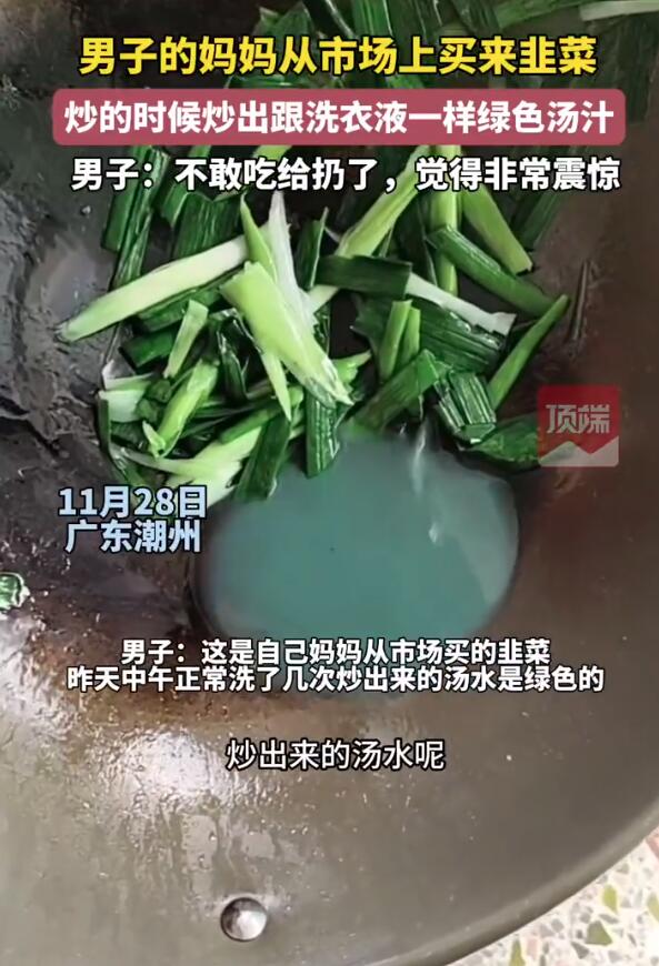 近日,广东潮州一男子的妈妈从市场买来韭菜,炒的时候炒出跟洗衣液一样的绿色汤汁。男子表示:“我们真的不敢吃,感觉太恐怖了。”