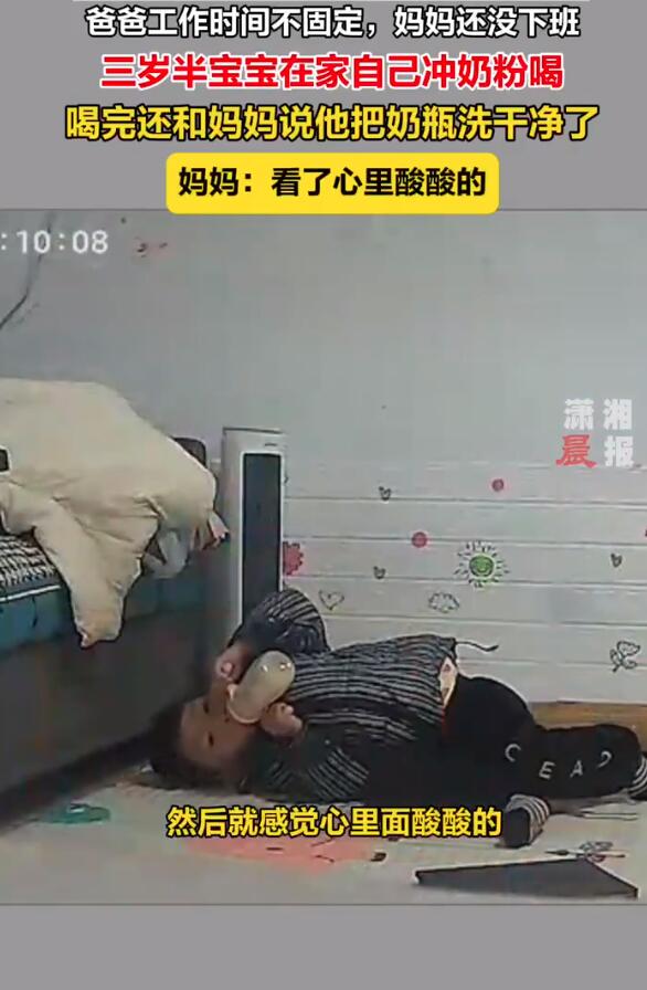 据潇湘晨报最新报道,12月12日,安徽合肥。爸爸工作时间不固定,妈妈还没下班,三岁半宝宝在家自己冲奶粉喝,喝完还对着监控和妈妈说他把奶瓶洗干净了。