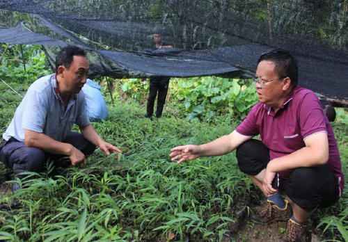 云南省科技特派员、西南林业大学董文渊教授(右)在大关县指导当地筇竹种植户育苗。