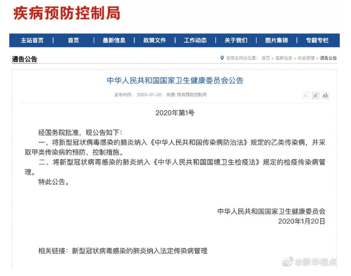 国家卫健委发布1号公告,将新型冠状病毒感染的肺炎纳入《中华人民共和国传染病防治法》规定的乙类传染病,并采取甲类传染病的预防、控制措施。将新型冠状病毒感染的肺炎纳入《中华人民共和国国境卫生检疫法》规定的检疫传染病管理。