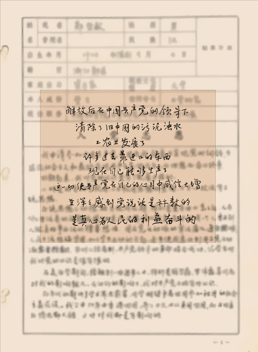 解放后在中国共产党的领导下,清除了旧中国的污泥浊水,工农业发展了,许多过去靠进口的东西,现在自己能够生产了,这一切使共产党在自己的心目中威信大增,并深深感到党说话是算数的,是真心为人民的利益奋斗的。(摘自郑哲敏1983年11月《入党志愿书》)