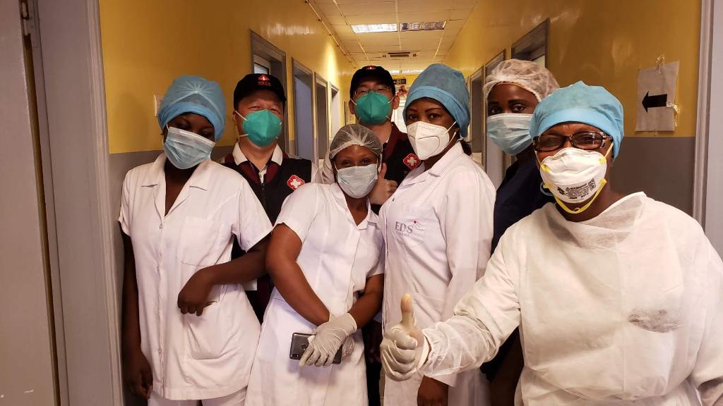 2020年5月26日,中国抗疫医疗专家组在刚果(布)首都布拉柴维尔指导新冠肺炎病房建设时,与当地一线医务人员合影。