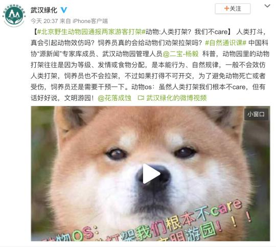 8日晚间,武汉市园林和林业局官方微博@武汉绿化 发布消息称,根据中国科协“源新闻”专家库成员、武汉动物园管理人员@二宝-杨毅 科普,动物园里的动物打架往往是因为等级、发情或食物分配,是本能行为、自然规律,一般不会效仿人类打架,饲养员也不会拉架,不过如果打得不可开交,为了避免动物死亡或者受伤,饲养员还是需要干预一下。动物os:虽然人类打架我们根本不care,但有话好好说,文明游园!
