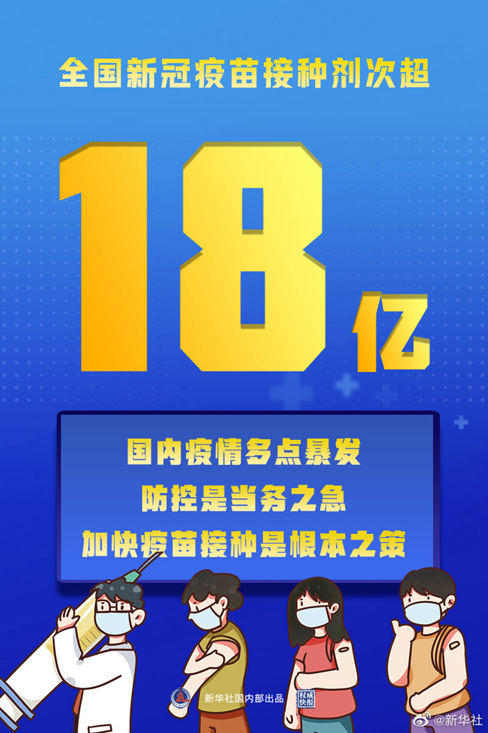 国家卫健委8月11日通报,全国新冠疫苗接种超18亿剂次。当前,全球疫情持续演变,病毒变异株陆续出现,国内疫情多点暴发,形势严峻复杂。国务院联防联控机制接连印发通知,部署新冠肺炎救治定点医院疫情防控和全员核酸检测组织管理工作。防控是当务之急,加快疫苗接种是根本之策。国家卫健委主任马晓伟表示,要始终把疫情防控作为重中之重,克服麻痹思想、厌战情绪、侥幸心理、松劲心态,坚决遏制当前疫情扩散蔓延,坚决巩固来之不易的防控成果。(记者徐鹏航;海报设计杨轶群)